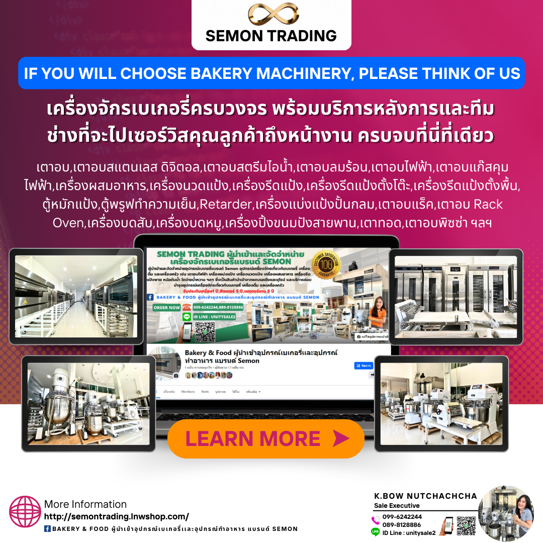 ผู้นำเข้าอุปกรณ์เบเกอรี่แบรนด์ Semon จำหน่ายอุปกรณ์เครื่องจักร เกี่ยวกับเบเกอรี่ เครื่องดื่ม และเครื่องครัว เช่น เตาอบไฟฟ้า เครื่องแบ่งแป้ง เครื่องนวดแป้ง เครื่องผสมอาหาร เครื่องรีดแป้งพาย หม้อต้มน้ำ โถจ่ายน้ำหวาน ฯลฯ ซึ่งเป็นสินค้านำเข้าจากแถบเอเชียและยุโรป และบริการซ่อมบำรุงอุปกรณ์เครื่องจักรเกี่ยวกับเบเกอรี่ เครื่องดื่ม และเครื่องครัว
